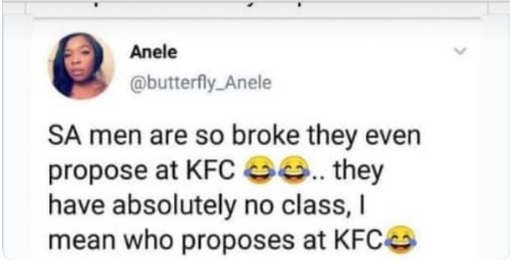 Todo comenzó en noviembre del 2019. La usuaria de Twitter @butterly_Anele, quien fue testigo de la romántica escena, sin dudarlo, compartió la imagen en su cuenta y con su lengua viperina, un texto escribió de forma descortés: “Hay hombres que están tan quebrados que se atreven a pedir matrimonio en KFC…no tienen clase, es decir, quién se atreve a comprometerse en un KFC”. La red social se dividió, ya que mientras algunos se divertían con su publicación, otros argumentaban que el amor no entiende de lugares.