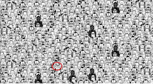 Lo que tienen que hacer aquí es encontrar al oso panda que se encuentra en un mar personajes de Star Wars. Acá la cosa también se complica porque toda la imagen está en blanco y negro. Pero claro, nada que ustedes no puedan lograr. Aquí les dejamos la imagen.