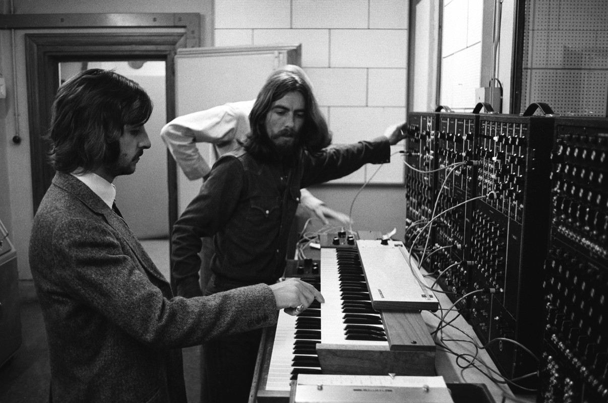 Quizá una de las imágenes más raras de este enorme combo es la que muestra a The Beatles trabajando en Abbey Road y en los estudios del mismo nombre. En ella vemos a George Harrison supervisando al querido Ringo Starr mientras este toca el (por aquel entonces recién salido) sintetizador Moog, el cual eran una serie de cajas a las que tenían que estar conectados y moviéndole para conseguir diferentes tonalidades y modulaciones. Este instrumento lo podemos escuchar claramente en rolas como “Here Comes The Sun” y “Because“.
