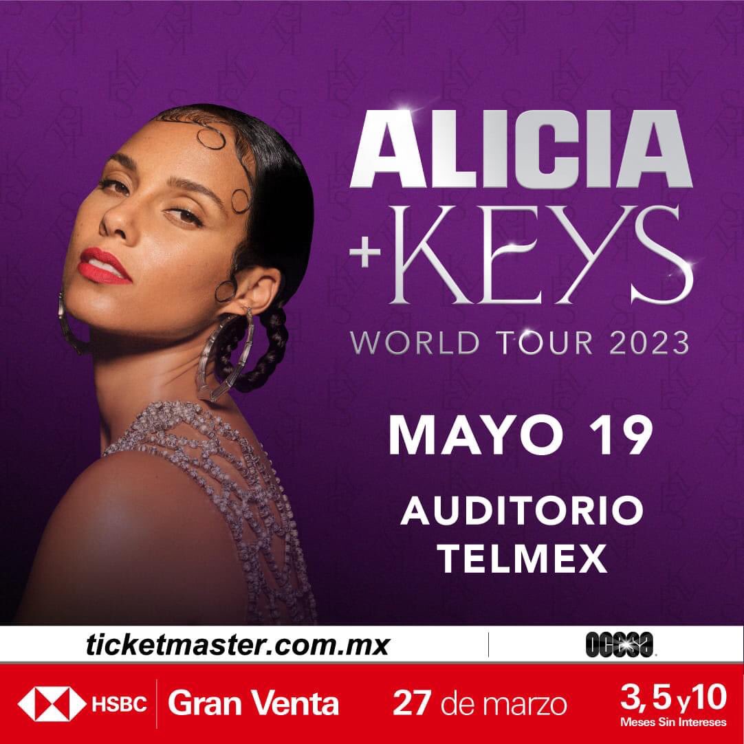 La 15 veces ganadora del Grammy dará un concierto e1 14 de mayo en el Auditorio Citibanamex, en Monterrey; el 17 de mayo será en el Auditorio Nacional, de la CDMX; mientras que el 19 de mayo Alicia Keys dará un concierto en el Auditorio Telmex de Guadalajara.