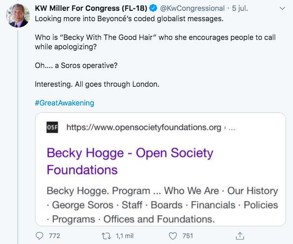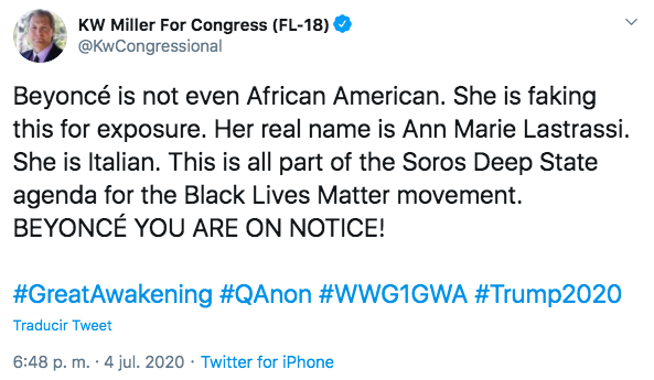 KW Miller dijo, para empezar, que Beyoncé no es afroamericana y que toda su vida, casi casi, se ha encargado de engañar a la gente a través de esto. Se echó la maravillosa puntada de decir que es italiana porque “su nombre real es Ann Marie Lastrassi… Todo esto es parte de la agenda del Soros Deep State sobre el movimiento Black Lives Matter“. El deep state, en teoría, es un grupo de personas con enorme influencia política y económica que manipula las políticas públicas de un país.