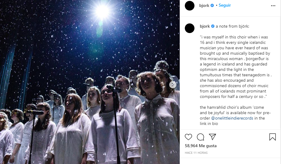 “Yo estaba en este coro cuando tenía 16 años y creo que todos los músicos islandeses de los que habrán escuchado fueron educados y bautizados musicalmente por esta mujer milagrosa. Thorgerdur es una leyenda en Islandia y ha guardado el optimismo y la luz en los tiempos tumultuosos que suceden en la adolescencia”, dijo Björk en Instagram sobre la colaboración y sobre la directora del coro Thorgerdur Ingolfsdottir.