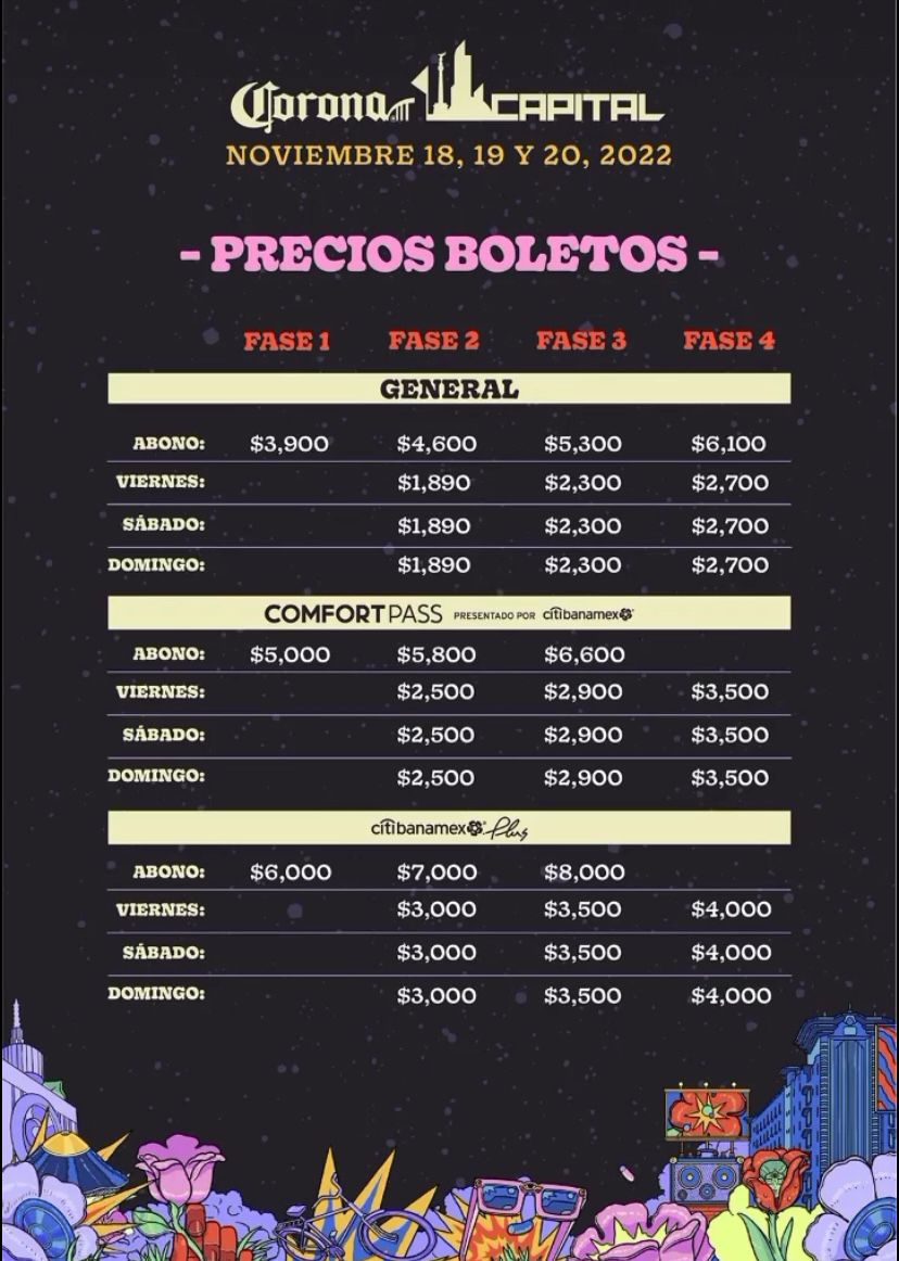 Para que se den una idea, los boletos individuales para viernes y domingo los estaba vendiendo en 3 mil 690 pesitos mexicanos, mientras que los del sábado y el abono de tres días los dejaba en 4 mil 500 y 9 mil 800 morlacos mexas.