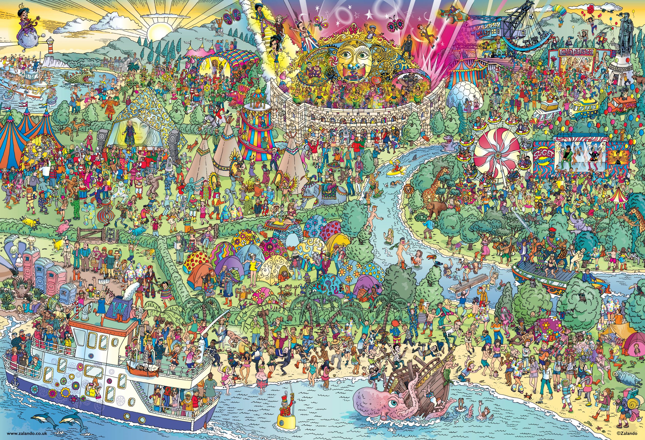 Adam Carnegie, el ilustrador atrás de este increíble mapa de conciertos, creo el panorama de una fiesta gigante en la que existen referencias a distintos festivales de música en el mundo. Algunos festivales que aparecen son el legendario festival británico Glastonbury, la cadena de festivales originaria de Chicago, Lollapalooza, la fiesta más grande del mundo que se lleva a cabo en Bélgica, Tomorrowland, el Melt! en Alemania y el Outlook celebrado en Croacia.