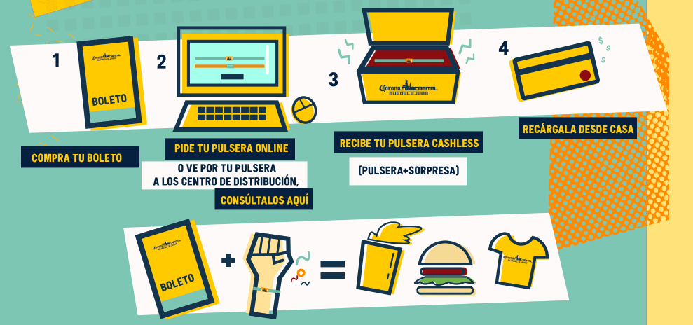 Si vas con un grupo de amigos, una o dos pulseras serán suficientes. ¿Y qué sucede si no me gasto todo lo de mi pulsera? Hay un sistema (en este enlace) para que te regresen la cantidad que dejaste abonada (no debe ser mayor a mil 500 pesos). Puedes pedir el reembolso en las zonas de recarga o pedirlo a tu tarjeta a partir del 16 de mayo hasta el 18 del mismo mes.