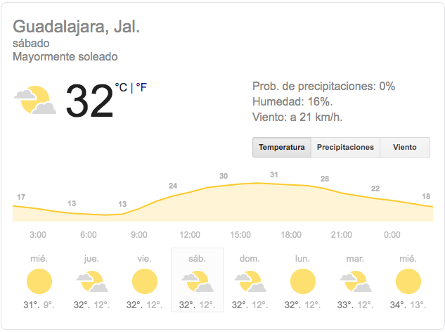 En el CCGDL hay que ser precavidos (y valer el doble). Es decir, lleva ropa fresca para el día y tarde y una buena chamarra para la noche. ¿La razón? Los pronósticos apuntan a que estaremos arriba de 30 grados. La buena noticia es que las posibilidades de lluvia son casi de cero. Así que no te preocupes –tanto– por el impermeable y la bota de lluvia.