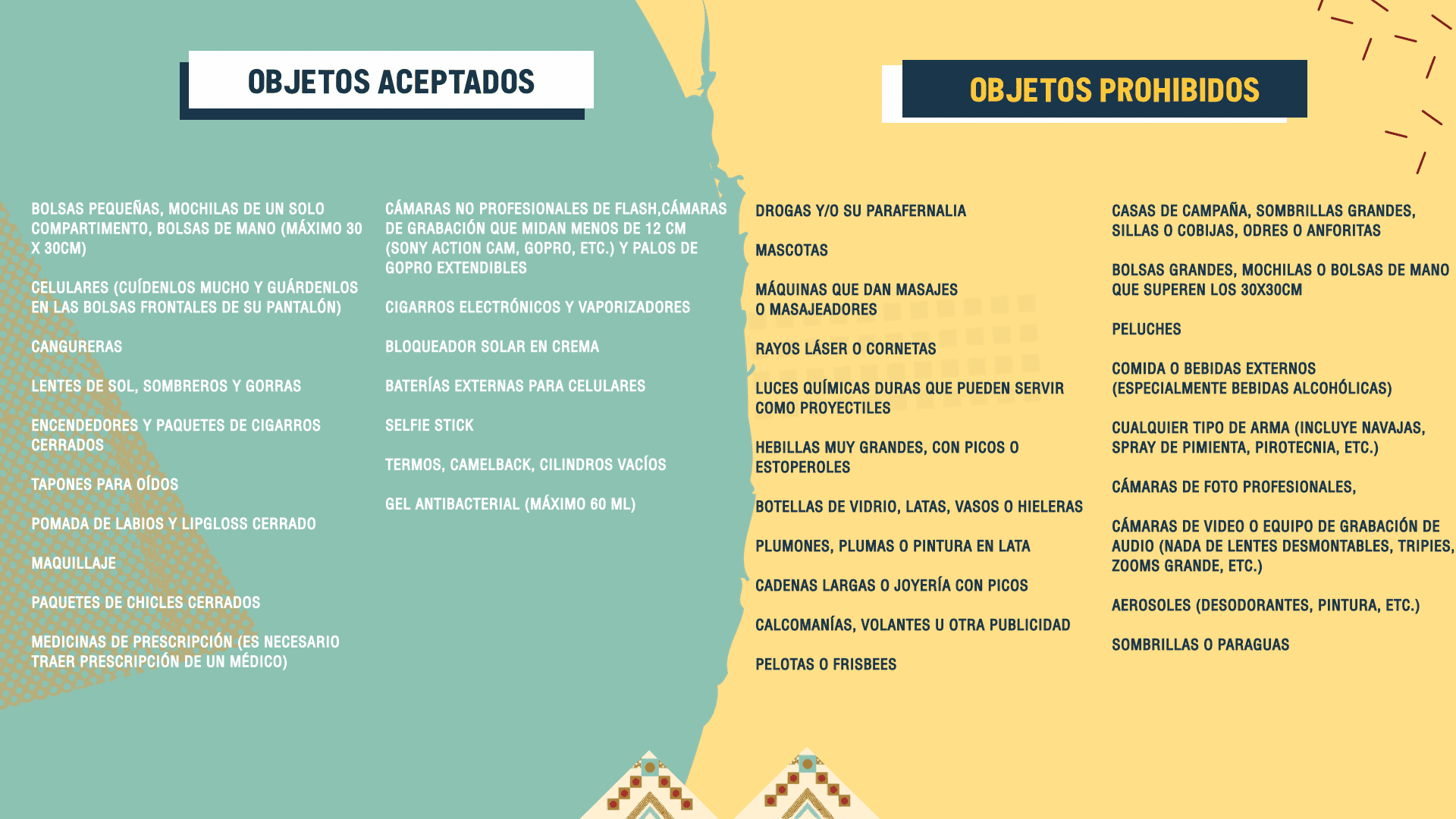 Unos lentes no le hacen mal a nadie y si no te molesta cargar, un sombrero tampoco está de más. Lo que es un sí obligatorio, es ponerte bloqueador solar de un factor mayor a 30. Procura que tu envase, si es que lo llevas al festival, sea menor de 100 mililitros.