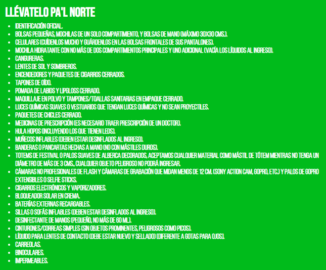 Bloqueador, gorras, mochilas pequeñas, chicles y cigarros cerrados. Esto es lo que Pa’l Norte te permite ingresar: