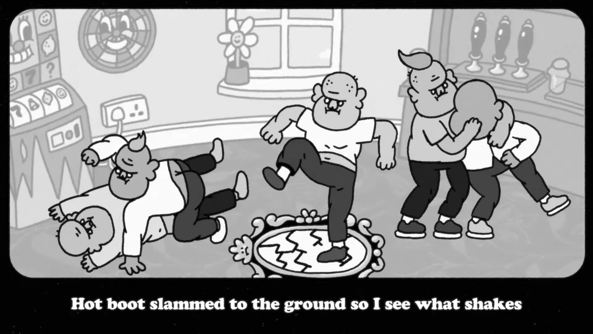Entonces es cuando nos damos cuenta que, al salir el sol, la gente entra a un bar (o un pub como se conocen en Inglaterra) para comenzar a golpearse mientras las versiones caricaturizadas de la banda tocan en un escenario. Dentro del bar todo es caótico, pero en el exterior todo parece mucho más apacible.