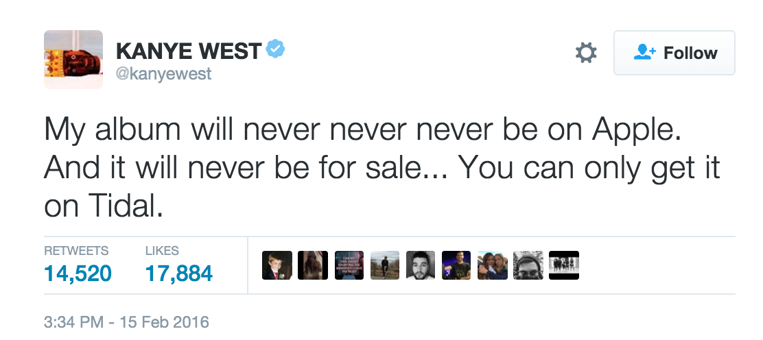 Todo comenzó en febrero de 2016, cuando se anunció que el, entonces, nuevo disco de Kanye West sería exclusivo de TIDAL, por lo que muchos fans se inscribieron en la plataforma y pagaron por el servicio. Sin embargo, a dos meses del lanzamiento de The Life of Pablo, el disco apareció en otras plataformas como Spotify, Apple Music y Google Pay, a pesar de que el mismo West tuiteara “Mi disco no va a estar on Apple nunca. Tampoco estará a la venta… Sólo lo podrás conseguir en TIDAL“.