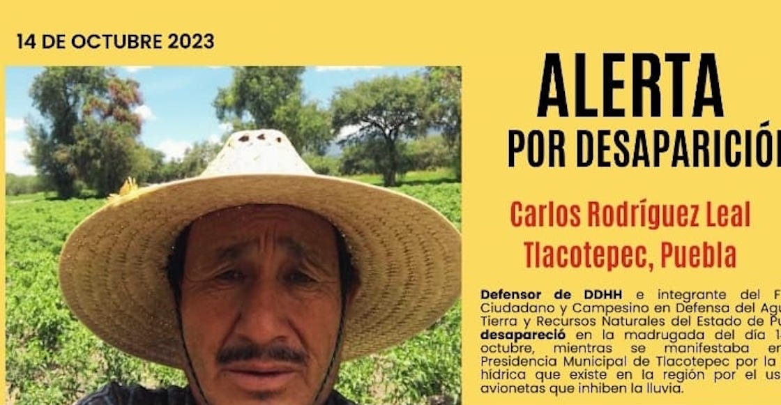 La coordinadora “Agua para Todxs Agua para la Vida” dio a conocer por medio de su página Facebook la desaparición del activista en defensa del agua, Carlos Rodríguez Leal. De acuerdo con la organización, el miembro de Frente Ciudadano y Campesino en Defensa del Agua, la Tierra y Recursos Naturales del Estado de Puebla desapareció la madrugada del 14 de octubre, mientras se manifestaba en la presidencia municipal de Tlacotepec.