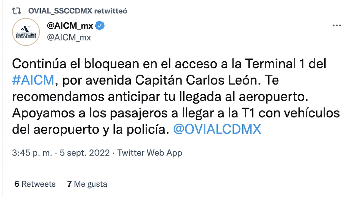 A la 1:14 de la tarde, el Centro de Orientación Vial de la SSC (Secretaría de Seguridad Ciudadana) de CDMX informó que seguía este plantón frente a la puerta 3 de la Terminal 1, recomendado a la gente que mejor tome Oceanía, Avenida Tahel y Avenida 602.