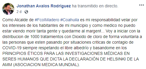 “Como Alcalde de Fco. I. Madero, Coahuila, es mi responsabilidad velar por los intereses de los habitantes de mi municipio, y como médico no puedo estar viendo morir a tanta gente y quedarme al margen… Voy a iniciar con la distribución de 1000 tratamientos con Dióxido de cloro de forma voluntaria a las personas que estén pasando por situaciones criticas de contagio de COVID-19, señaló.