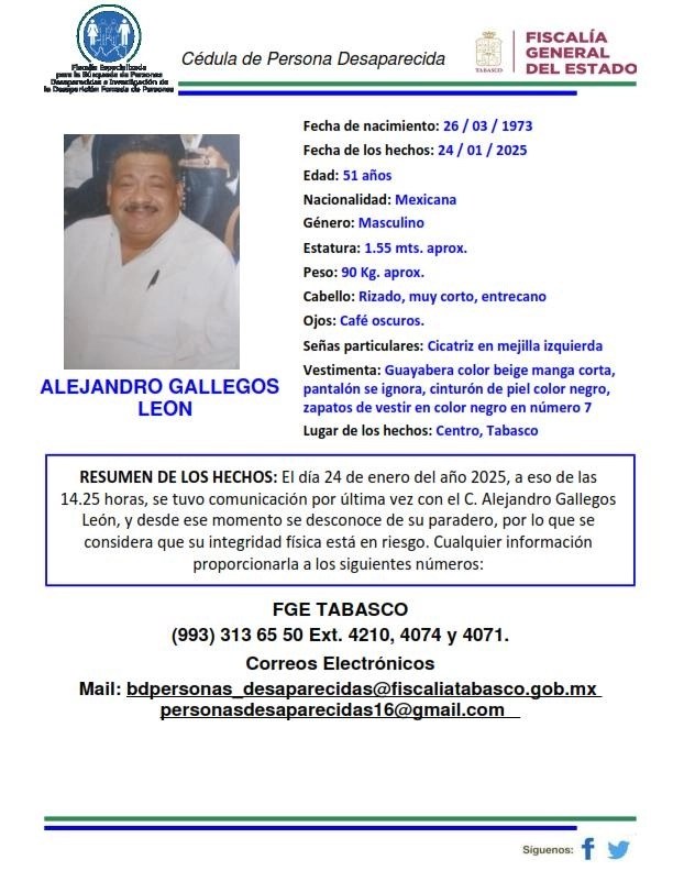 Alejandro Gallegos, periodista, catedrático y columnista, fue reportado cómo desaparecido el viernes 24 de enero del 2025. Tristemente el sábado 25 fue localizado sin vida en el municipio de Cárdenas, Tabasco.