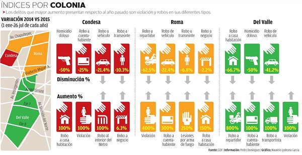 Y así sucede igual en la colonia Condesa… según los números de los quejosos barbudos que se atreven a denunciar: aumento en robo a casa habitación, a transportistas y a la gente que les lleva cositas a casa (o sea, repartidores): uno de cada uno en este 2015… pero de estos no había conocimiento en el año pasado.