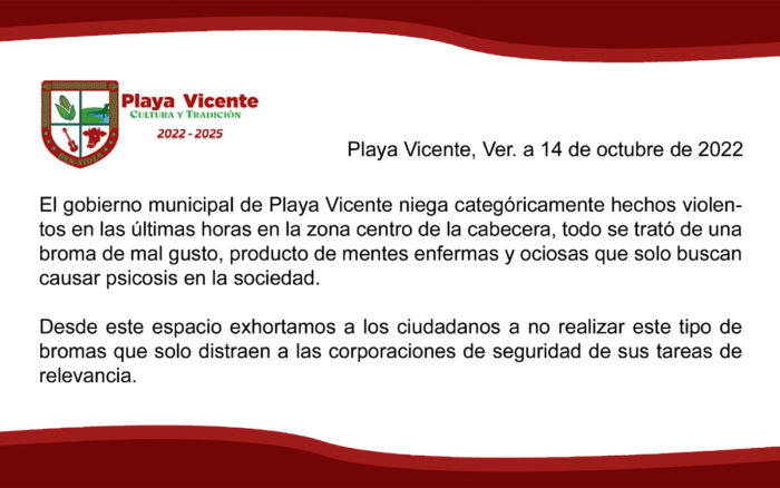 De acuerdo con medios locales, el Ayuntamiento de Playa Vicente publicó un comunicado en donde informaba a los habitantes que no había ocurrido algún tipo de crimen o situación que involucrara al crimen organizado por lo que no había de qué preocuparse.