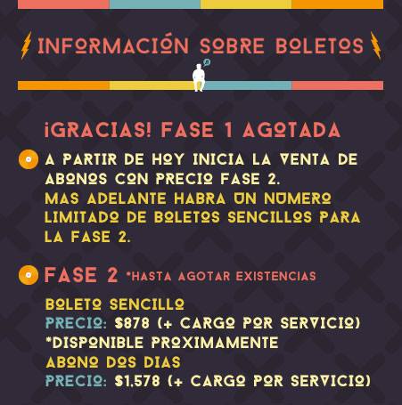 A través de redes sociales, los organizadores del festival acaban de anunciar que la primera fase de venta de boletos está oficialmente agotada. A partir de hoy, el abono de 2 días tendrá un costo de 1,578 pesos (más cargos). Esta fase incluirá, próximamente, venta de boletos por día.
