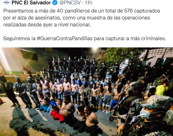 A cuatro días de endurecer operativos en contra de pandillas (y quienes sólo sean sospechosos de ser parte de ellas) y 72 horas de haber decretado régimen de excepción, el presidente Bukele presume que ya tiene detenidas a más de 2 mil personas.