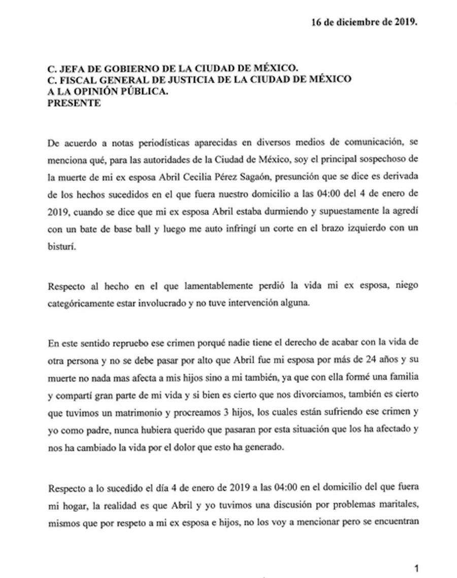 “De acuerdo con notas periodísticas aparecidas en diversos medios de comunicación, se menciona qué, para las autoridades de la Ciudad de México, soy el principal sospechoso de la muerte de mi ex esposa Abril Pérez Sagaón, presunción que se dice es derivada de los hechos sucedidos en el que fuera nuestro domicilio a las 04:00 del 4 de enero de 2019, cuando se dice que mi ex esposa Abril estaba durmiendo y supuestamente la agredí con un bate de base ball y luego me auto infringí un corte en el brazo izquierdo con un bisturí”.