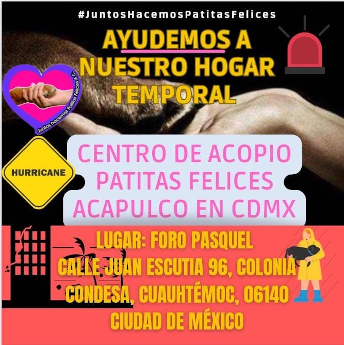 Patitas Felices Acapulco está recibiendo donativos para animales damnificados en el Foro Sylvia Pasquel, en la colonia Condesa de la CDMX, en un horario de 09:00 a 17:00 horas.