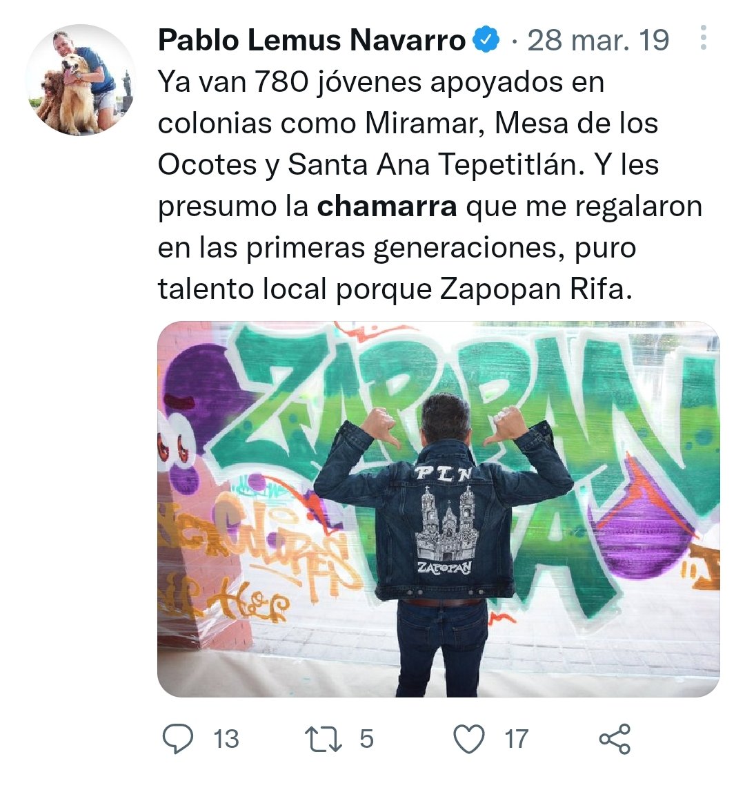 “Ya van 780 jóvenes apoyados en colonias como Miramar, Mesa de los Ocotes y Santa Ana Tepetitlán. Y les presumo la chamarra que me regalaron en las primeras generaciones, puro talento local porque Zapopan Rifa”, se lee.