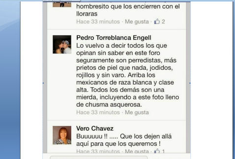 Los mensajes que orgullosamente colocó el correligionario de los neonazis de Puebla, fueron hechos para contrarrestar las fuertes críticas vertidas contra los panistas detenidos en Brasil, acusados de causar graves lesiones a un hombre que intentó defender a su esposa de los manoseos que fue víctima. En resumen, para Torreblanca Engell, todo aquel que esté contra la conducta de los ex diputados Miguel Medina Pederzini y Sergio Israel Eguren es porque es “jodido, rojillo y sin varo”, además de “chusma asquerosa”.
