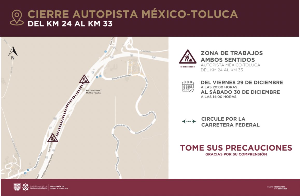La autopista México-Toluca, como ya les contamos aquí arriba, cierra por las obras de la segunda fase del Tren Interurbano “El Insurgente”, a partir de las 20:00 horas del viernes 29 de diciembre y hasta las 14:00 horas del sábado 30 de diciembre de 2023.