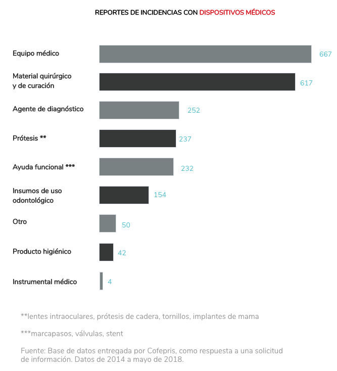 Según información de la propia Cofepris, entre 2014 y junio de 2018 se tenían 2 mil 254 reportes de incidentes “adversos”, de los cuales 55 fueron catalogados como “graves”. De todos estos reportes, los más frecuentes tienen que ver con el equipo médico, así como el material quirúrgico y de curación.