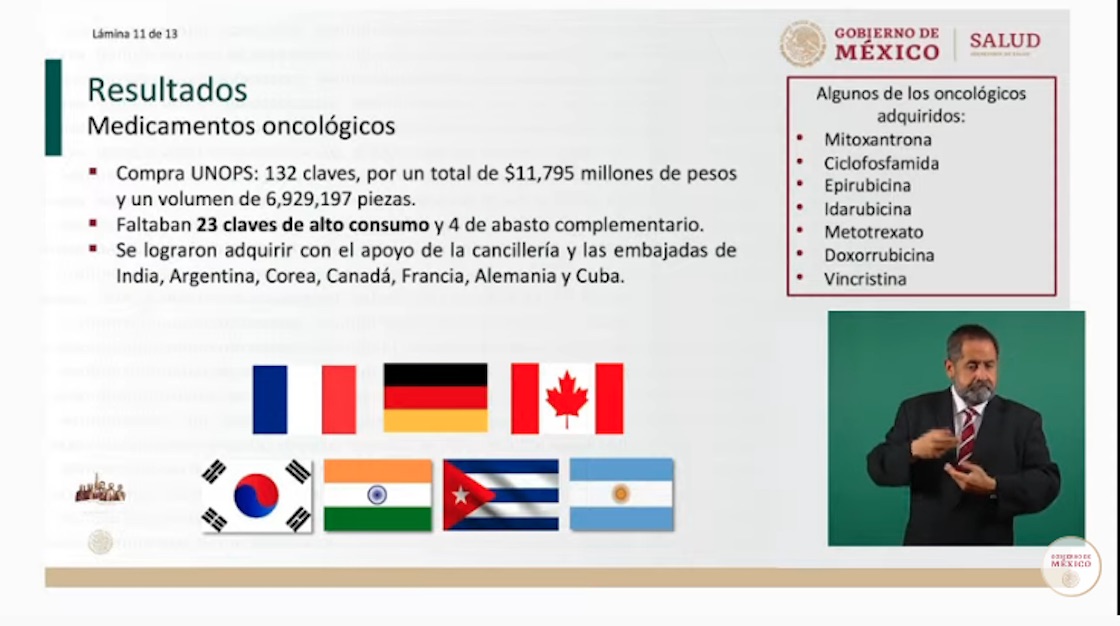 En cuanto a los medicamentos oncológicos —importantísimos y necesarios para niños y niñas con cáncer así como las personas que padecen esta enfermedad—, Alcocer explicó que aquí intervino la Secretaría de Relaciones Exteriores (SRE) para poder cubrir 23 claves de alto consumo y cuatro de abasto necesario.