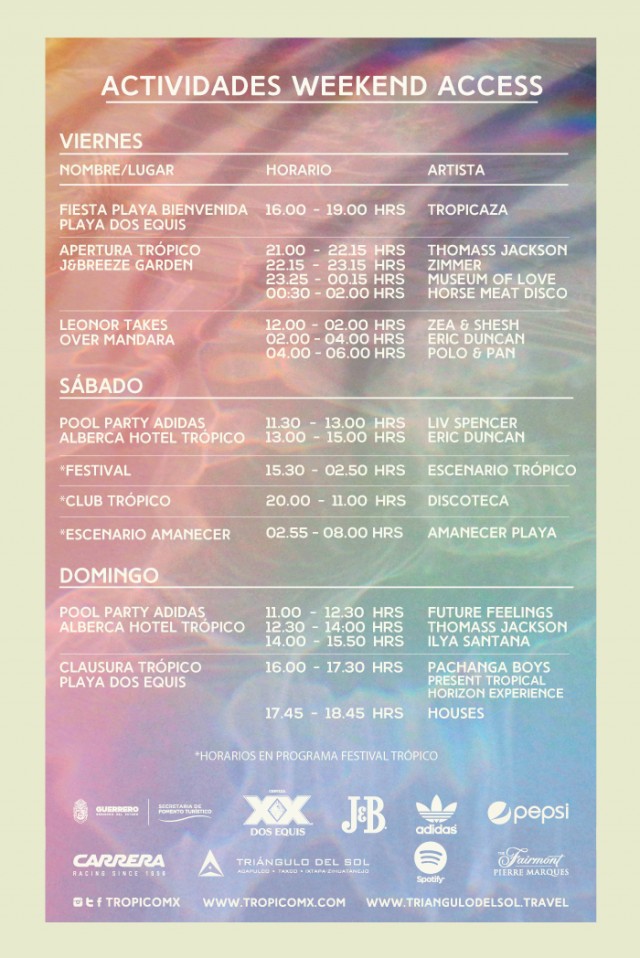 Aparte de estos eventos, tanto el viernes como el domingo cuentan con actividades en los distintos foros que estarán abiertos al asistente que obtenga el paquete de fin de semana (weekend access). En la apertura del Trópico, actos como Horse Meat Disco, Museum of Love y Zimmer les darán la bienvenida a los recién llegados. Y para los que tengan energía para seguir la fiesta el domingo, la clausurá contará con la participación de Pachanga Boys y Houses en la denominada Playa Dos Equis.