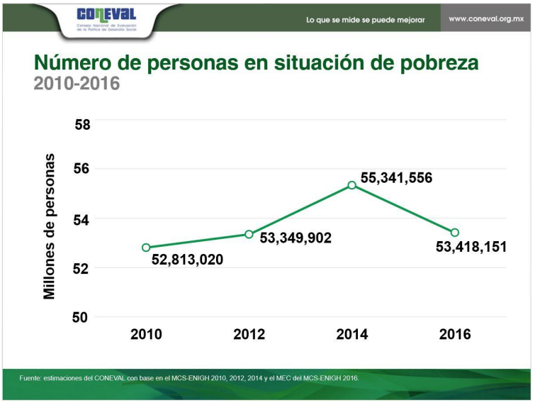 En 2016 el numero de personas en situación de pobreza fue de 53.4 millones (el 43.6%), en 2014 fue de 55.3 millones (el 46.2%) y en el 2012 se registraron 53.3 millones (el 45.5%).