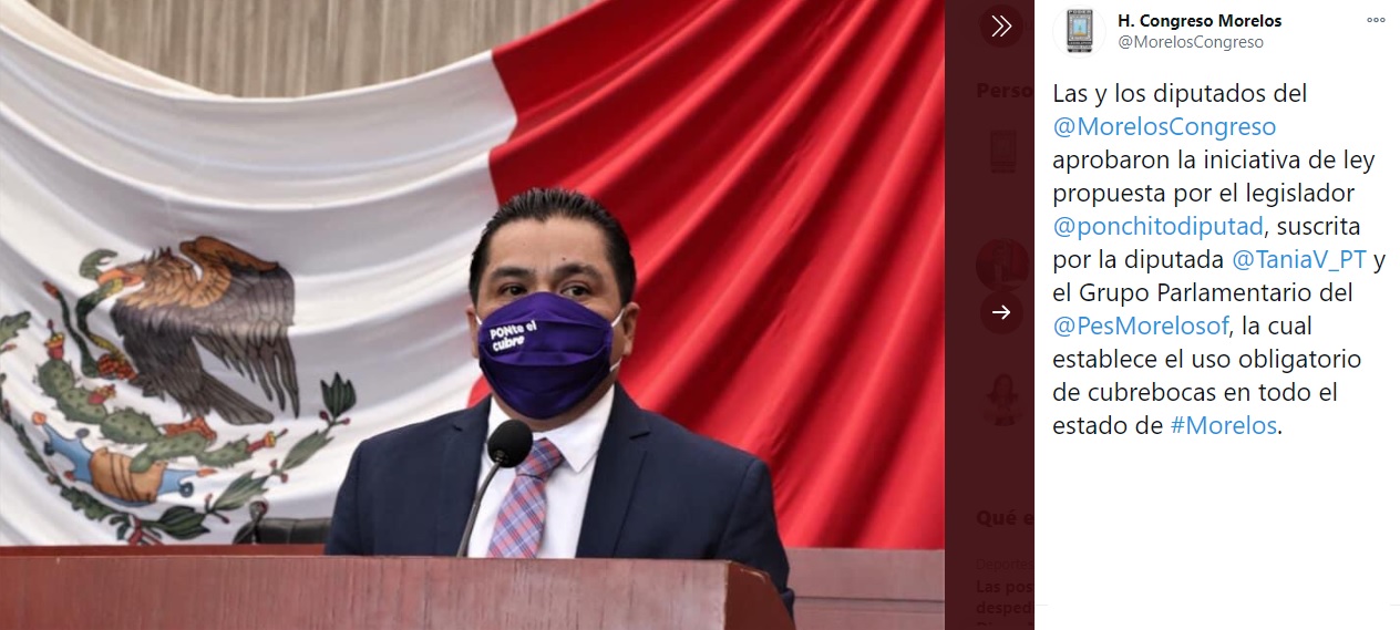 Con una mayoría de 17 votos y dos abstenciones, el Congreso de Morelos aprobó la ley que hace obligatorio el uso de cubrebocas. Esto por iniciativa del diputado local por el XI Distrito electoral, Alfonso de Jesús Sotelo Martínez.