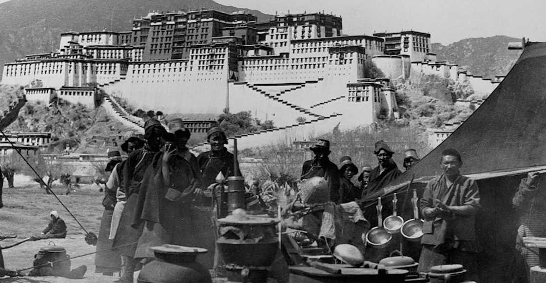 “tibetanos junto a una tienda de campaña, con el Potala, el palacio del Dalai Lama, detrás de ellos”. Foto: Getty Images.