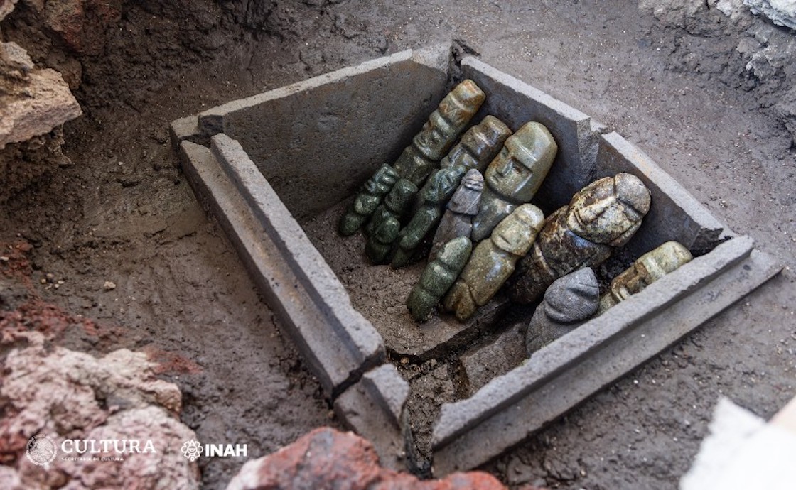 Pues al abrir la caja y explorarla, el equipo del Proyecto Templo Mayor encontró 14 esculturas antropomorfas masculinas y una figura femenina, todas talladas en piedras verdes. Además, destacaron, la más grande mide unos 30 centímetros de alto, y la más pequeña unos tres centímetros, cada una con “rasgos esquemáticos característicos del estilo Mezcala de la sierra norte de Guerrero”.