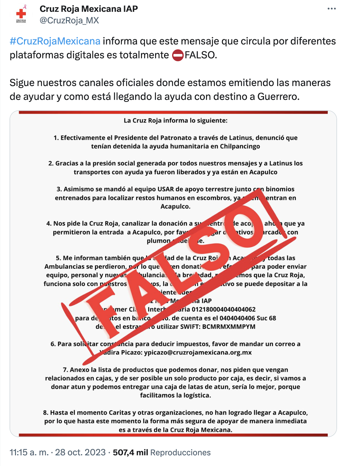 ¿Qué dijo la institución?: “La Cruz Roja Mexicana informa que este mensaje que circula por diferentes plataformas digitales es totalmente FALSO. Sigue nuestros canales oficiales donde estamos emitiendo las maneras de ayudar y como está llegando la ayuda con destino a Guerrero”.