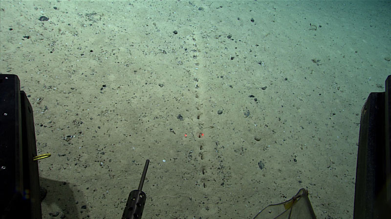 Por ejemplo, vamos a observar a detalle esta foto. Para dimensionar de qué tamaño es la hilera de agujeros vamos a poner atención en los dos puntos rojos en el fondo del mar que se hacen con un láser desde el submarino. Estos dos puntos están separados por 10 centímetros.