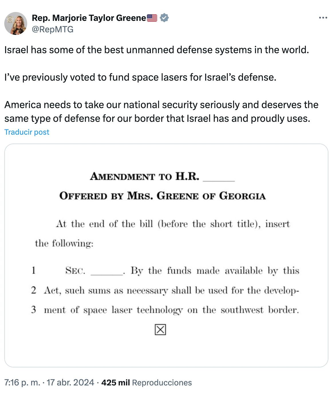 Recientemente la legisladora republicana de Estados Unidos, Marjorie Taylor Greene, presentó una enmienda –una propuesta de modificación de un proyecto– ante la Cámara de Representantes con el objetivo de ¿desarrollar un láser espacial para la frontera sur?