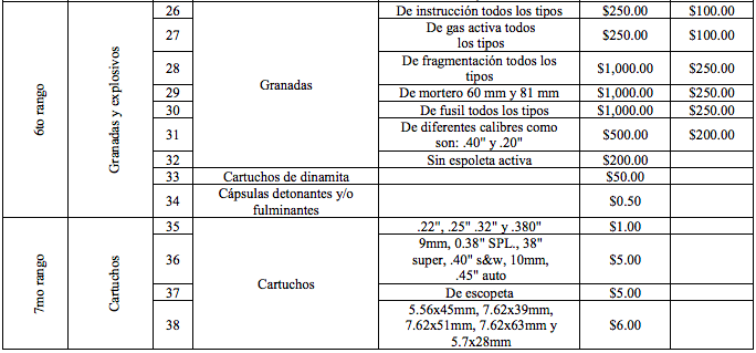 Mientras te dan de 150 a 200 pesitos por armas de fabricación casera; para las ametralladoras ligeras o pesadas dan hasta 18 mil pesos; y por rifles AK 47, Ar 15, G3 y FAL darán hasta 16 mil pesotes.