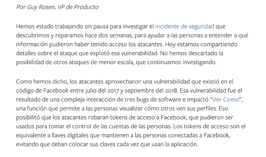 Y agregó otro detalle: Facebook no podrá informar, por lo pronto, sobre los posibles orquestadores de este ataque cibernético.