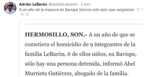 “Me voy enterando por un tweet que detuvieron a un probable participante de la masacre de mi familia, no nos avisó la FGR”, criticó Adrián LeBarón. A un año pretenden subsanar sus “resultados”… de 100 participantes hoy ya tienen a 2. ¡cuesta trabajo entenderlos! ¿Gracias?”