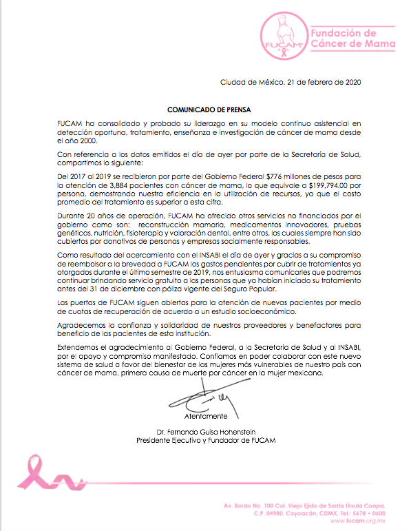 Es importante recordar que tras el anuncio de que desaparecerían los tratamientos gratuitos que FUCAM ofrecía por convenio con el Seguro Popular, el Gobierno Federal emitió un boletín para señalar que dichos tratamientos son pagados por el gobierno y que, “por una obligación ética, moral y jurídica”, dicha Fundación debería continuar con ellos. En ese comunicado se informó que el gobierno pagó 776 millones de pesos de 2017 a 2019 para la atención gratuita de las mujeres con cáncer de mama.
