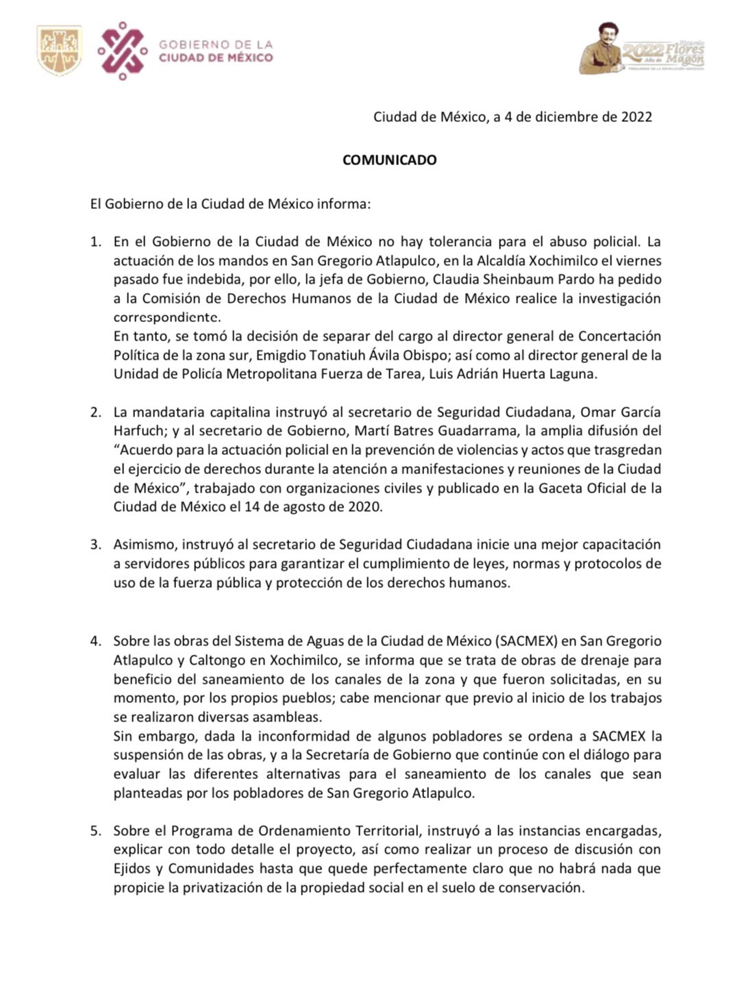 “En el Gobierno de la Ciudad de México no hay tolerancia para el abuso policial. La actuación de los mandos de San Gregorio Atlapulco, en la alcaldía Xochimilco el viernes pasado fue indebida“, comienza el comunicado antes de señalar que Claudia Sheinbaum pidio a la Comisión de Derechos Humanos que inicie una investigación.