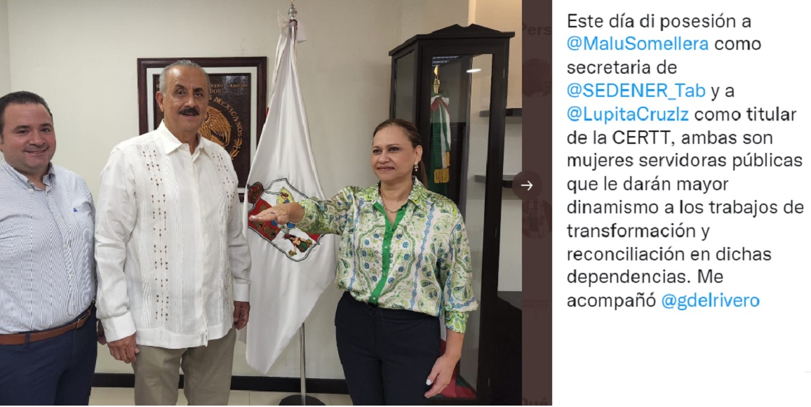 “Este día di posesión a Malú Somellera como secretaria de Energía de Tabasco y a Lupita Cruz como titular de la CERTT”, anunció el gobernador. “Ambas son mujeres servidoras públicas que le darán mayor dinamismo a los trabajos de transformación y reconciliación en dichas dependencias”.