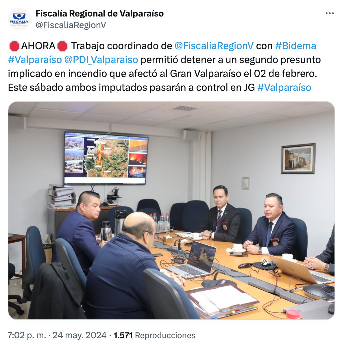 El 24 de mayo pasado, la Policía de Investigaciones de Chile detuvo a los acusados de provocar el incendio. Se trata de Francisco Mondaca, un bombero voluntario, y Franco Pinto, exfuncionario de la Corporación Nacional Forestal.