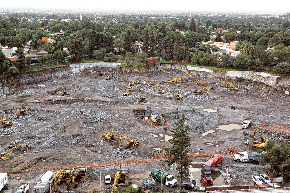 “En la etapa de excavación se extrajeron más de 1,200,000 m3 de roca basáltica y tepojal, para poder llegar al nivel de desplante de cimentación que se encuentra a 22 metros bajo el nivel de banqueta para albergar los 6 niveles de estacionamientos y servicios.”