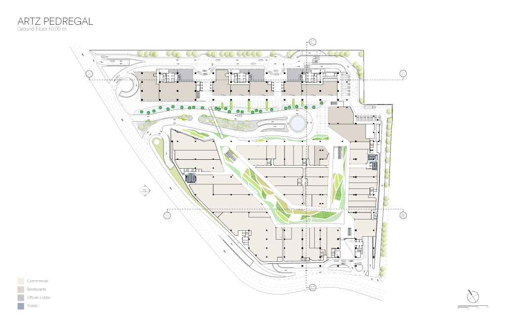 Se planeó construir en dos etapas: en la primera etapa se ejecutó la construcción del centro comercial, distribuido en 3 niveles con un jardín central en el tercer nivel en donde se desplanta una galería de arte, alcanzando los 81 mil 752 metros cuadrados de construcción, junto con tres torres de oficinas de aproximadamente 20 mil metros cuadrados cada una.
