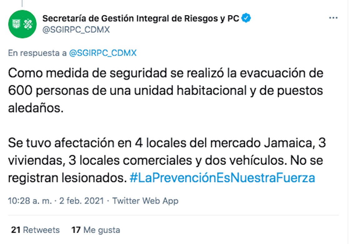 Así que a manera de prevención, Protección Civil CDMX se encargó de evacuar a 600 personas de una unidad habitacional y comercios cercanos.