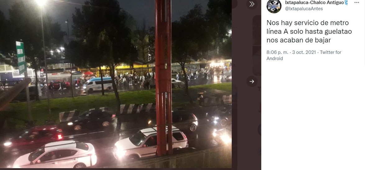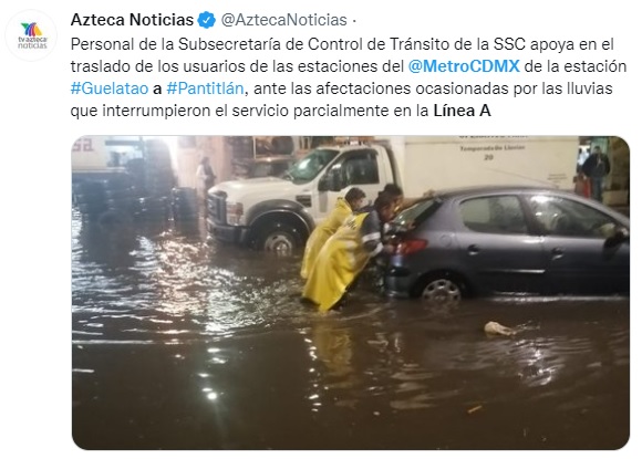 De acuerdo al comunicado del Metro, la suspensión del servicio se debe a la acumulación pluvial (inundaciones, pa’ la banda) que hay en los exteriores de las instalaciones de la Línea A…. seeeee, en los exteriores.