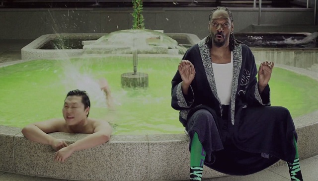 2) Psy chapoteando en una fuente de agua radioactiva. Mientras vemos a Snoop tratando de rockear una mallas con una horrible bata de baño, Psy anda haciendo busitos y pataleando en una fuente con agua radioactiva… todo está simplemente mal.