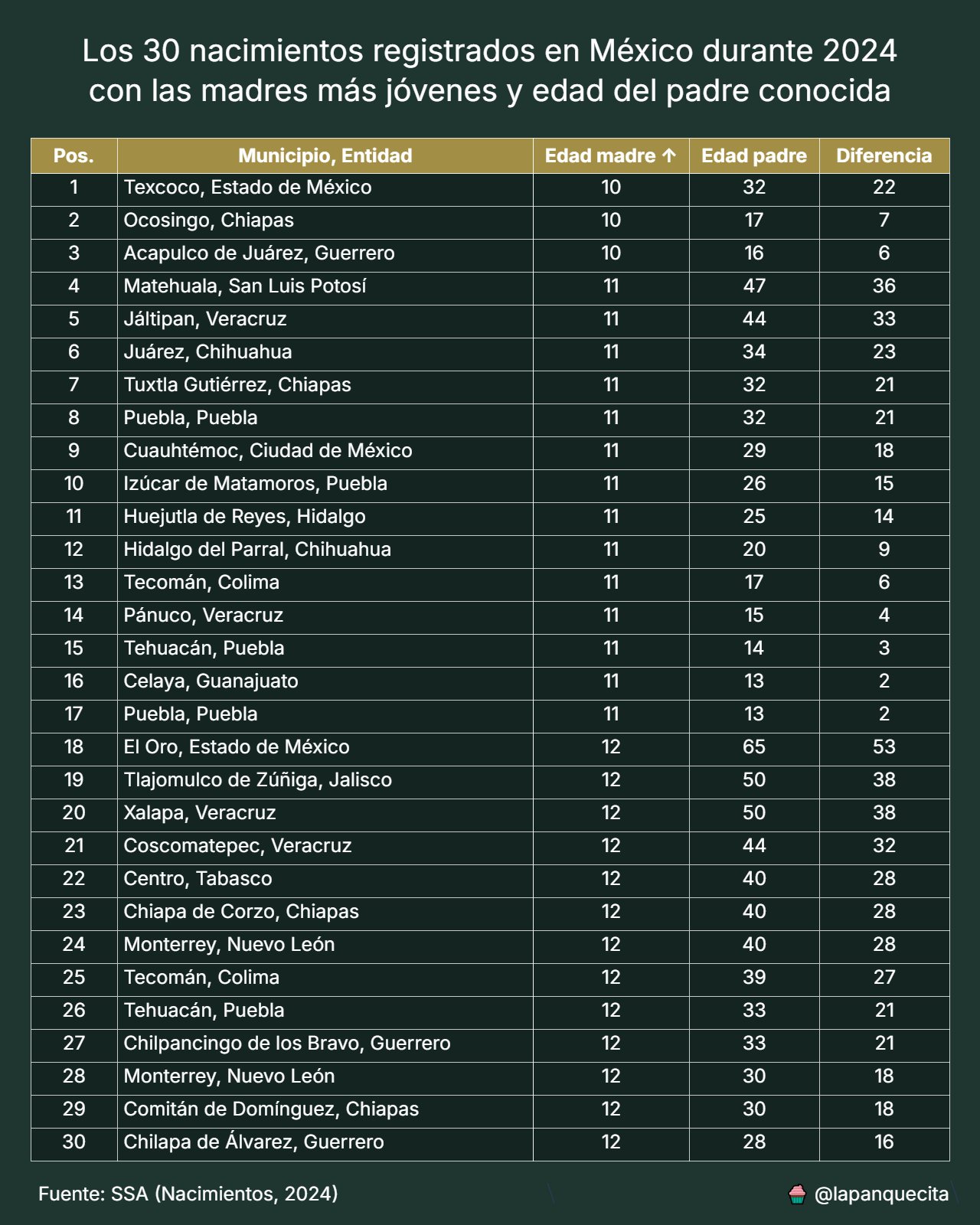 Las cifras de los 30 nacimientos con madres más jovenes del 2024 se puede resumir en tres edades, 10, 11 y 12 años.
